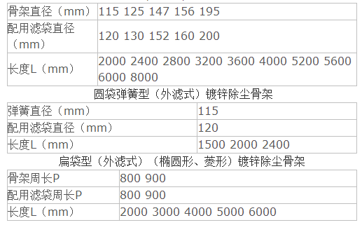 鍍鋅除塵骨架 與濾袋接觸的表面應平滑光潔,不允許有焊疤、凹凸不平和毛刺,以使除塵濾袋經過除塵器主風機的強大風壓及反吹風機清灰或脈沖閥噴吹風清灰的反復噴吹清灰時,或振打袋式除塵器的振打清灰時與除塵骨架摩擦不會損壞。