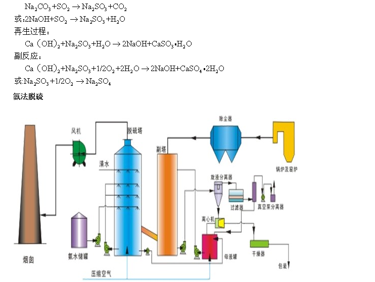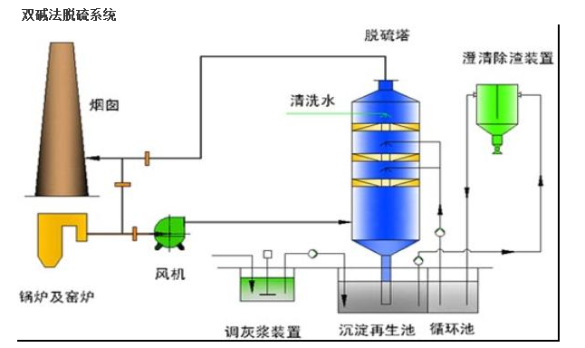 為了克服石灰/石灰石法容易結垢和堵塞的缺點,發展了雙堿法。該法先用可溶性的堿性清液作為吸收劑吸收,然后再用石灰乳或石灰對吸收液進行再生。反應如下:脫硫過程